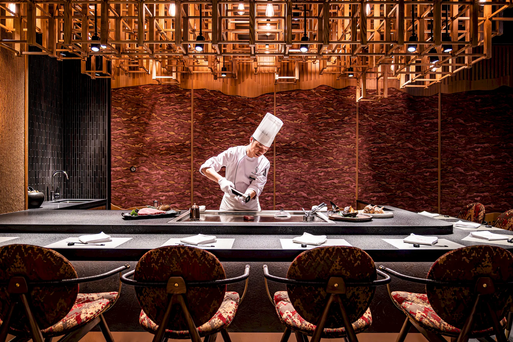 The Stage (本舞台) consists of five separate Teppanyaki rooms, each designed to provide an intimate and engaging dining experience. The careful selection of materials and finishes, such as timber and stone, adds warmth and texture to the space, while the thoughtful lighting design highlights the artistry of the chefs and the beauty of the cuisine. The layout ensures that each guest has a clear view of the chef's performance, allowing for a more interactive and immersive experience.