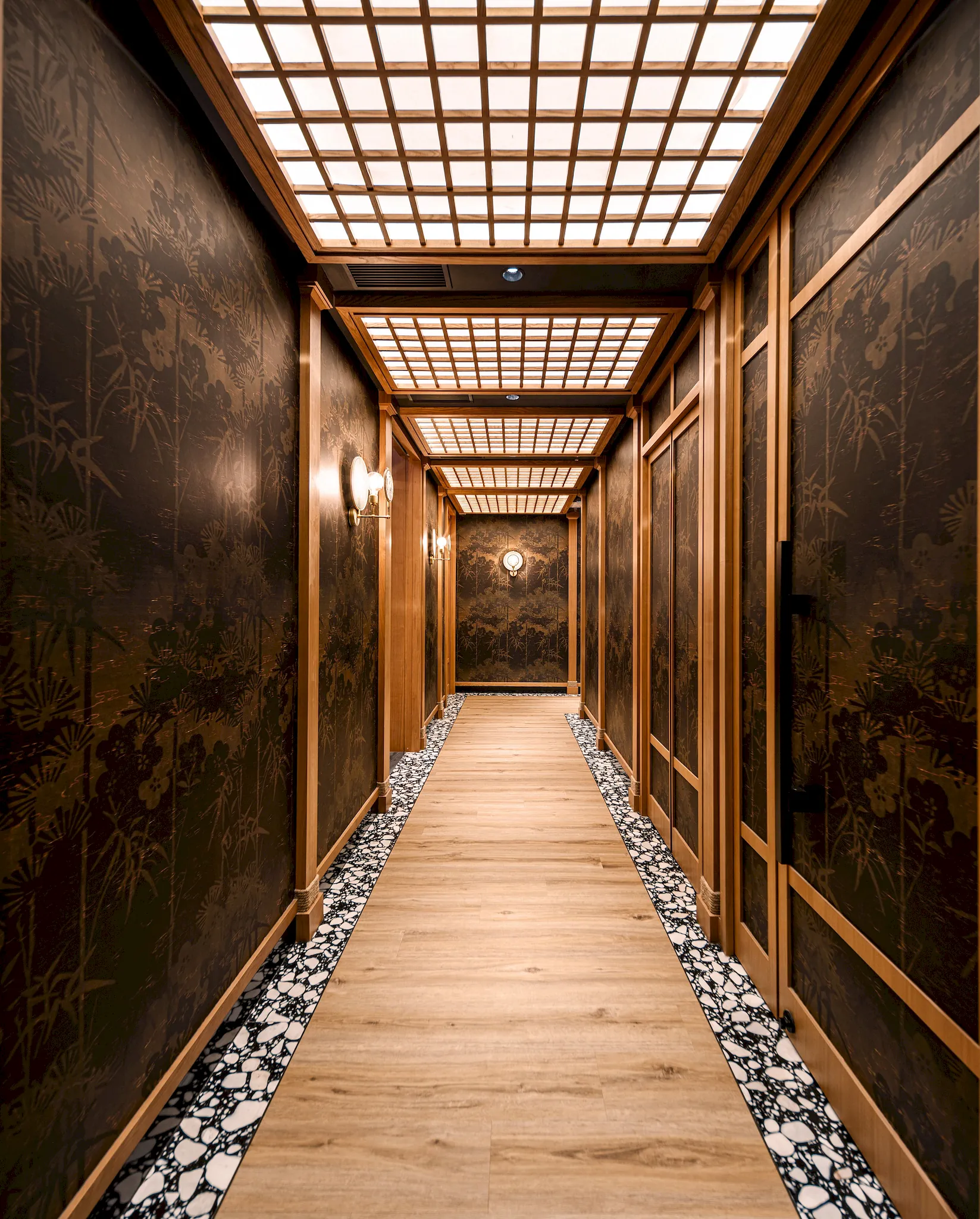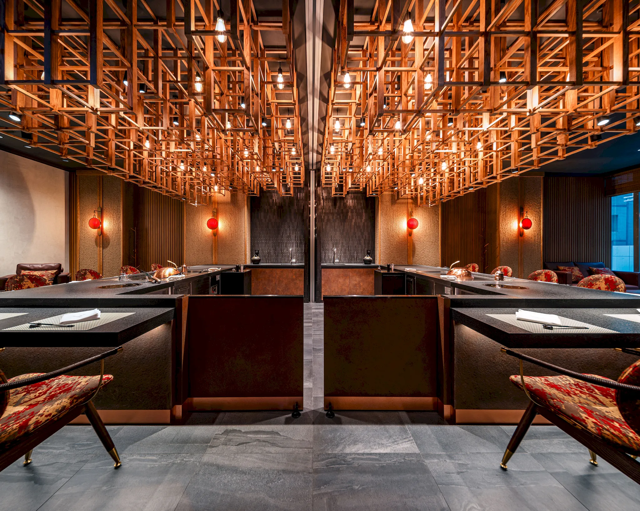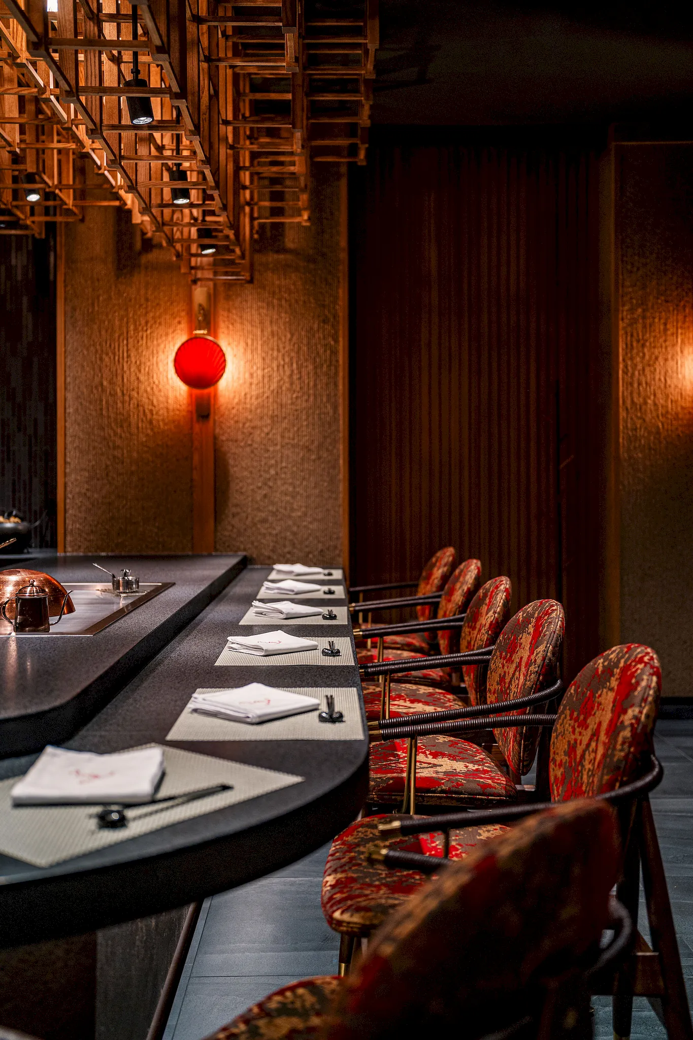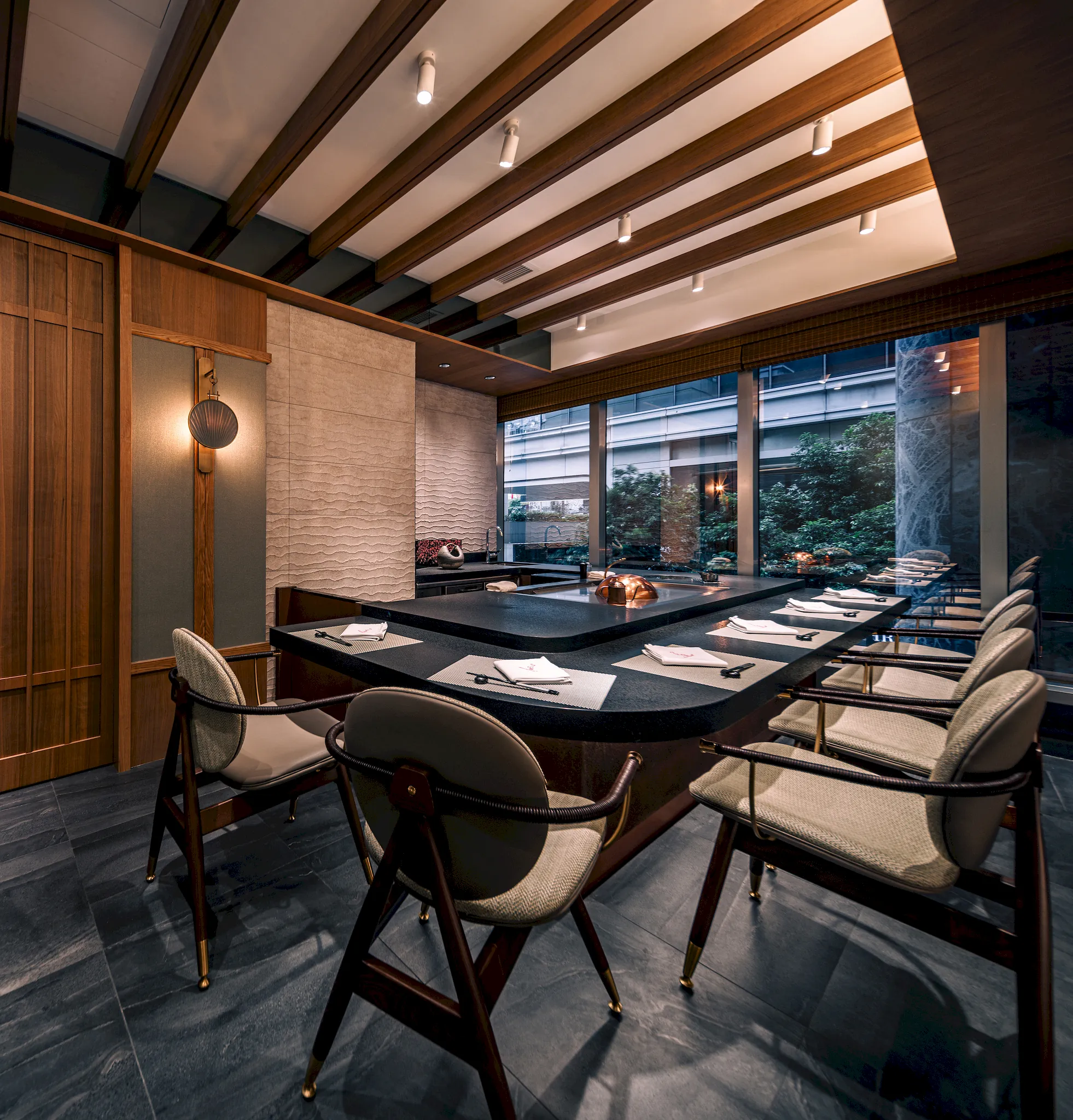 For Hana Sakazuki, our team was tasked with creating an innovative and elegant Japanese design for a high-end teppanyaki restaurant in the heart of Causeway Bay, Hong Kong. Drawing inspiration from the classical Japanese Noh theatre, we aimed to transform the dining experience into a culinary performance, blending tradition with contemporary sophistication.